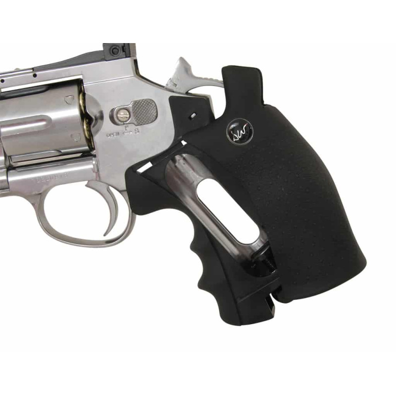 - Airsoft Dan Wesson 4" Silver revolveris, 6 vnt dėtuvės (gilzės), 22 mm Picatinny pavaža, naudojimo instrukcija.