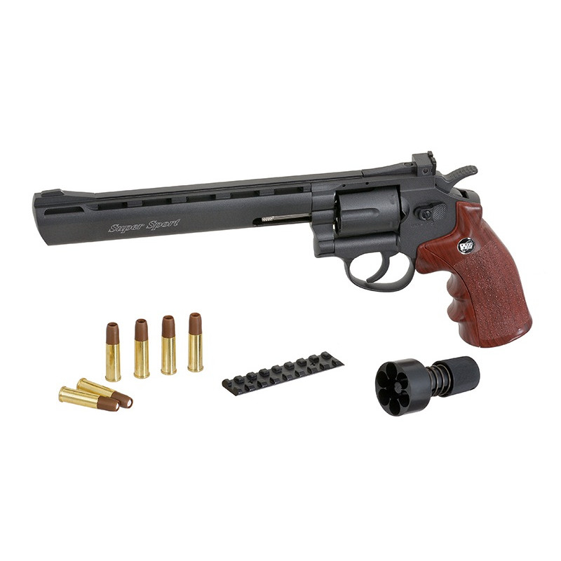 - Airsoft Super Sport 8" revolveris, 6 vnt dėtuvės (gilzės), 22 mm Picatinny pavaža, naudojimo instrukcija.